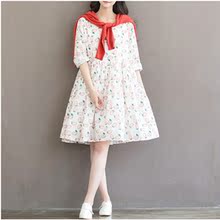 森女系秋装小清新学院风中长款娃娃领樱桃印花宽松棉麻长袖连衣裙