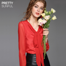 2017春装新款雪纺衫衬衫女长袖v领系带修身百搭衬衣小衫上衣潮