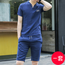 夏天运动套装男夏季2017新款学生亚麻短袖男T恤v领青少年休闲潮流