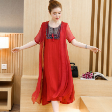 2017夏装新款民族风假两件绣花飘逸丝麻连衣裙圆领短袖宽松中长裙