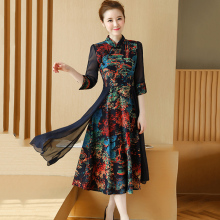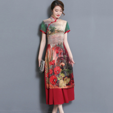 2017新款复古印花真丝雪纺改良奥黛旗袍中式斜襟立领短袖连衣裙夏
