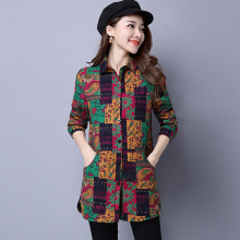2016秋冬新款文艺复古印花棉麻夹棉衬衫外套女中长款大码保暖衬衣