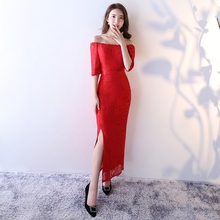 敬酒服2017新款夏季一字肩中袖连衣裙新娘结婚礼服红色旗袍长款女