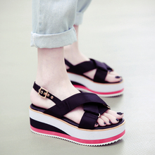 松糕鞋女凉鞋2017夏季新款韩版女鞋彩虹底一字带百搭坡跟厚底鞋潮