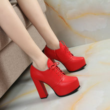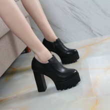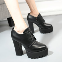 韩范低帮深口单鞋女粗跟超高跟厚底女鞋系带侧拉链防水台高跟鞋女