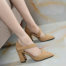 欧美尖头粗跟凉鞋魔术贴气质名媛白领工作鞋2017春款中空绒面单鞋