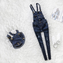 秋冬季深蓝色破洞背带牛仔裤女排扣连体裤背带裤小脚裤弹力吊带裤