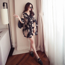 6066#特大码女装胖mm春夏装新款喇叭袖V领雪纺连衣裙高腰碎花裙
