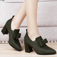 2017春秋季新款尖头粗跟单鞋韩版百搭蝴蝶结女鞋磨砂皮深口高跟鞋