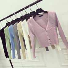 春秋新款韩版V领显瘦小披肩长袖针织开衫女修身短款薄款毛衣外套