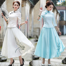2017夏季新时尚文艺女生修身上衣短款民国唐装旗袍两件套装连衣裙