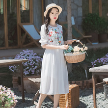 2017春夏新款复古文艺范小清新森女刺绣长袖雪纺连衣裙仙女中长裙