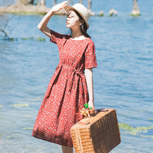 2017春夏新款文艺复古棉麻碎花短袖红色大摆收腰显瘦连衣裙