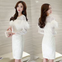 2017春装新品 韩版复古气质蕾丝刺绣羽毛流苏连衣裙包臀礼服裙女