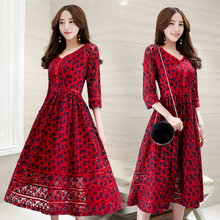 2017春季新品 韩版显瘦中长款v领五分袖蕾丝连衣裙潮打底A字裙子