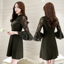2017春秋新款女装韩版显瘦时尚蕾丝连衣裙九分袖喇叭袖大码