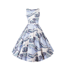 赫本风欧美复古连衣裙一字领海浪印花棉质大摆修身显瘦度假长裙女
