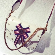 猫女王2017新款蝴蝶结女士小方包徽章链条包珍珠包包简约斜跨包潮