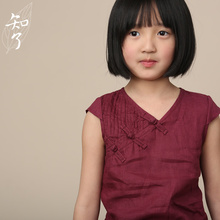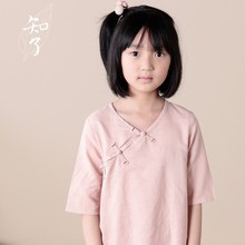 知了童装 女童文艺复古棉麻中式女童竹节棉 圆领夏短袖t恤K4052