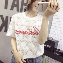 2017夏季新款韩版学生字母刺绣T恤修身显瘦百搭短袖女士蕾丝衫潮