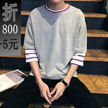 港风夏装新款学生七分袖T恤假两件条纹男士韩版上衣宽松圆领体恤