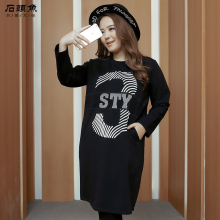 石头鱼2017秋新款胖mm中长款宽松t恤女大码200斤圆领长袖口袋上衣
