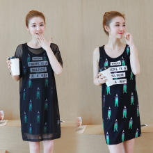 加大码女装宽松t恤裙中长款胖mm网纱罩衫+无袖背心连衣裙两件套装