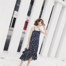 2017春季新款韩版复古中长款v领碎花雪纺连衣裙女夏沙滩吊带裙子