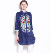 大码衬衣胖MM春夏新款七分袖显瘦中长款绣花民族风刺绣棉麻衬衫女