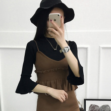2017春季半高领纯色修身显瘦打底衫七分喇叭袖针织新品毛衣上衣女