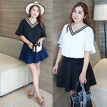 新款加肥加大码女装胖妹妹印花假两件套装胖mm秋季衬衣条纹连衣裙