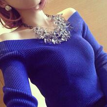 春季新品女装长袖弹性针织打底衫修身百搭露肩一字领性感毛衣冬季