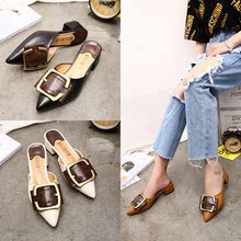2017春夏新款欧美英伦风女鞋时尚复古皮带扣尖头平底凉拖鞋女半拖