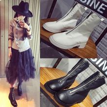 网红同款马丁靴仿羊皮前拉链做旧粗跟瘦腿中筒pu皮春秋潮短靴女83