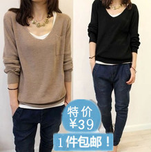 春秋新款宽松长袖V领显瘦套头毛衣女大码韩版打底衫针织衫外套