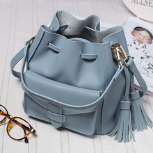 2017韩国牛皮流苏包抽带水桶包真皮小包单肩斜跨复古子母包女包