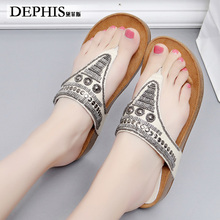 DEPHIS/黛菲斯防滑沙滩串珠平底人字拖 女真皮坡跟夹脚软木凉拖鞋