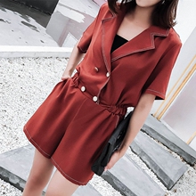 明线西装领短袖连体裤女夏阔腿短裤韩版宽松显瘦松紧腰连衣裤薄款