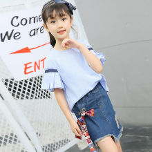 童装2017新款韩版儿童夏装上衣中大童喇叭袖衬衣女童休闲条纹衬衫