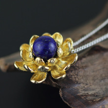 原创925纯银饰女款镀金镶青金石淡水珍珠项坠莲花吊坠