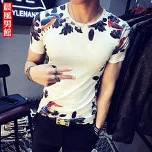 夏季夜店碎花男士短袖T恤男装打底衫精神小伙韩版修身半袖衣服男