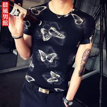 夏装蝴蝶印花男士短袖T恤男装网红同款韩版修身衣服男半袖体恤潮