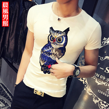 夏季猫头鹰贴布男士短袖T恤男装青年上衣韩版修身衣服男半袖体恤