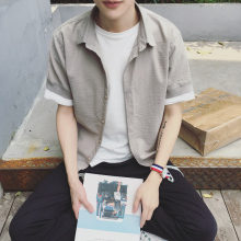 2016夏季新款 韩版男士下摆系带短袖衬衫 潮男文艺小清新休闲衬衣