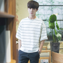 2017新款夏潮男宽松蝙蝠衫条纹5分袖短袖T恤时尚休闲男装文艺港风