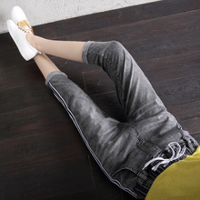 松紧腰牛仔裤女烟灰色七分裤百搭侧边条纹裤韩版六分学生哈伦女裤