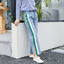 2017春季新款浅蓝色直筒牛仔裤九分裤时尚休闲拼接撞色毛边女下装