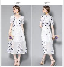蔚家时尚女装2017夏季新款裙子绣花短袖连衣裙V领刺绣中长一步裙