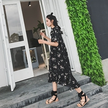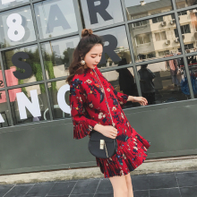 薇语大码女装2017夏新品雪纺碎花连衣裙复古衬衫式鱼尾裙加大宽松