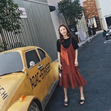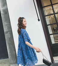 薇语大码女装2017春夏新品蕾丝两件套半袖连衣裙复古宽松显瘦裙子
